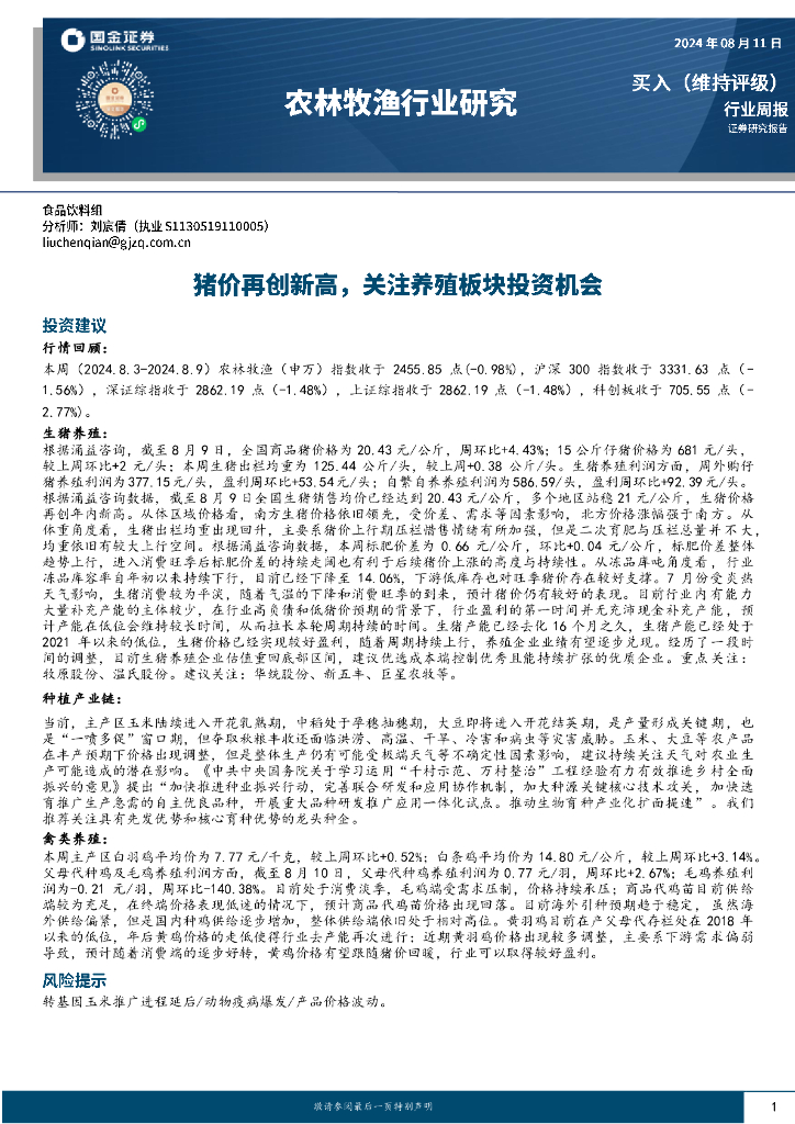 国金证券:农林牧渔行业研究周报:猪价再创新高,关注养殖板块投资机会.pdf