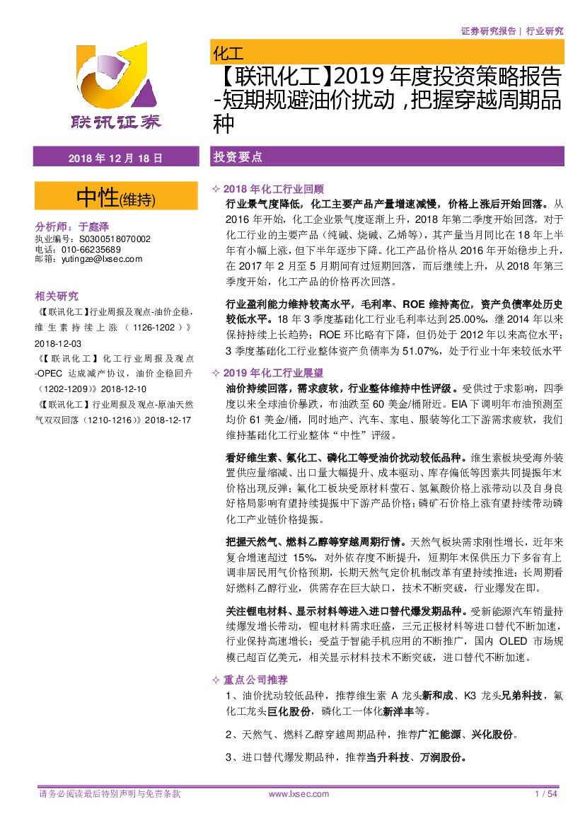 联讯证券:【联讯化工】2019年度投资策略报告-短期规避油价扰动,把握穿越周期品种.pdf