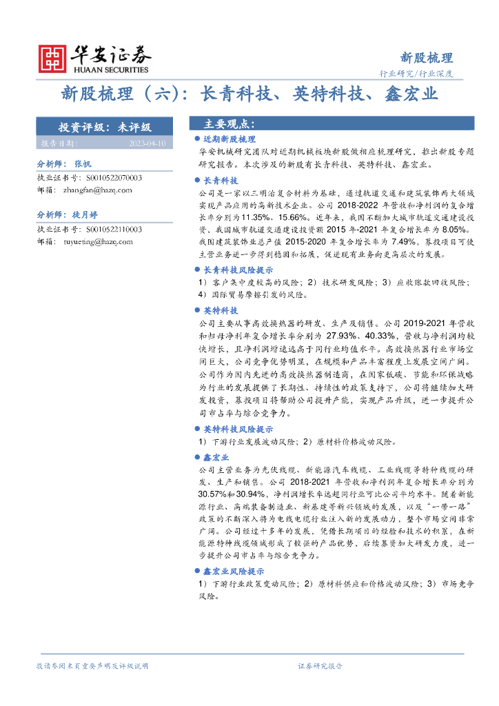 华安证券:机械行业深度:新股梳理(六):长青科技、英特科技、鑫宏业.pdf