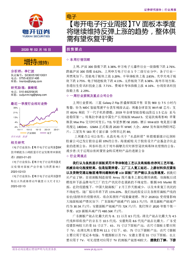 粤开证券:【粤开电子行业周报】TV面板本季度将继续维持反弹上涨的趋势,整体供需有望恢复平衡.pdf