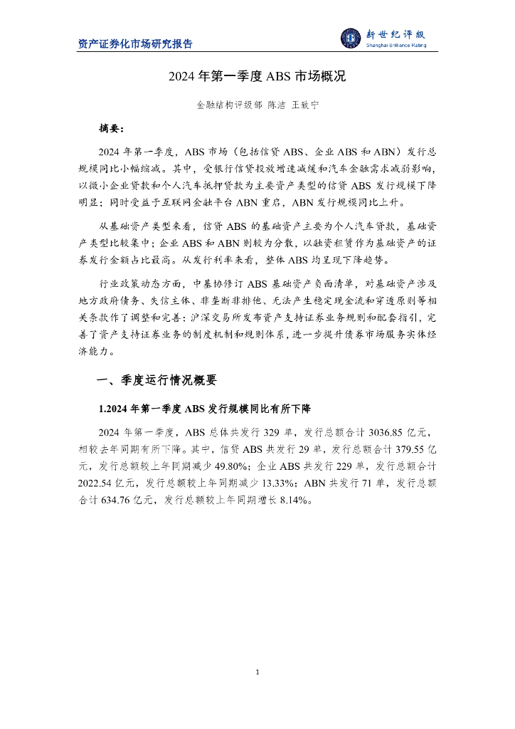 新世纪评级:2024年第一季度ABS市场概况报告.pdf