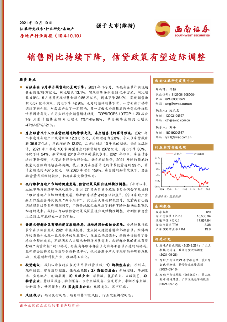 西南证券:房地产行业周报:销售同比持续下降,信贷政策有望边际调整.pdf