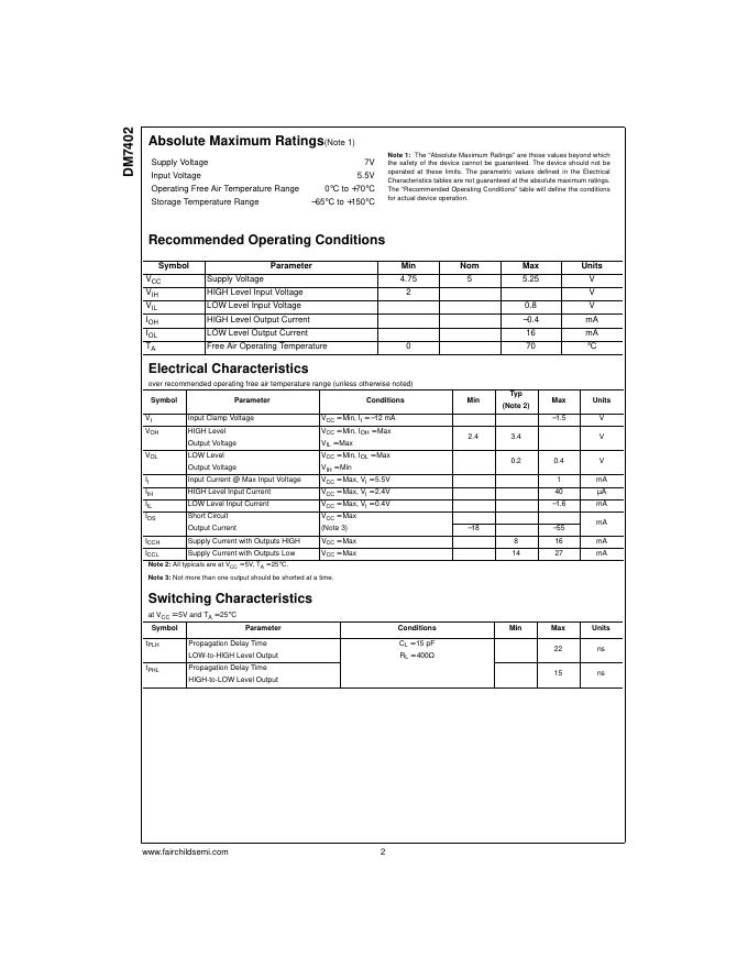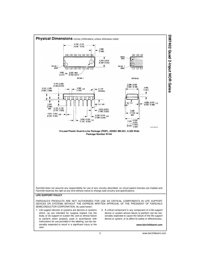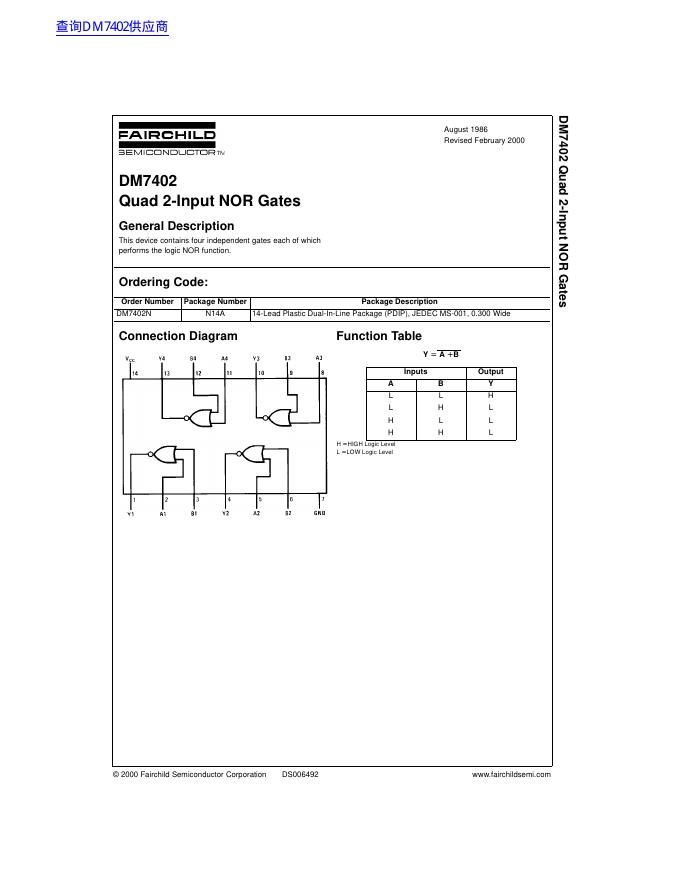 FAIRCHILD semiconductor DM7402 Quad 2-Input NOR Gates 数据手册.pdf