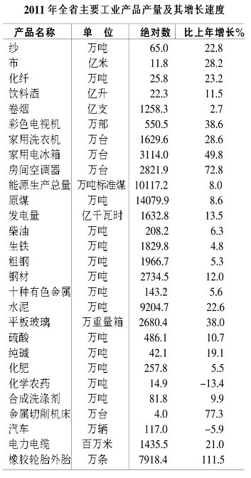 全省37个工业行业增加值全部增长,其中通信设备、计算机及其他电子设备制造业增长78.7%,纺织服装、鞋、帽制造业增长42.3%,电气机械及器材制造业增长31.8%,金属制品业增长29.6%,通用设备制造业增长27.7%,非金属矿物制品业增长24.4%,化学原料及化学制品制造业增长19.1%,农副食品加工业增长18.7%,黑色金属冶炼及压延加工业增长15.1%,有色金属冶炼及压延加工业增长14%,交通运输设备制造业增长13.7%,电力、热力的生产和供应业增长11.1%,煤炭开采和洗选业增长9.3%。六大高耗能行业增加值增长16.1%,装备制造业增加值增长28.3%,高新技术产业增加值增长24.6%,战略性新兴产业产值增长62.1%。