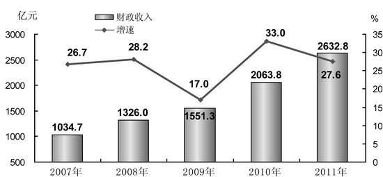 全年财政收入2632.8亿元,比上年增长27.6%,其中地方财政收入1463.4亿元,增长27.3%。全部财政收入中,增值税增长27.9%,营业税增长29.9%,企业所得税增长44.8%。财政支出3305.7亿元,增长27.7%。其中,社会保障与就业支出增长16.6%,医疗卫生支出增长49.1%,城乡社区事务支出增长23%,文化体育与传媒支出增长19.9%,教育支出增长45.7%,科学技术支出增长20.6%。全年33项民生工程累计投入468亿元,惠及6000万城乡居民。