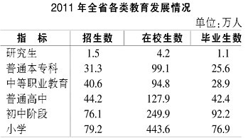 年末全省共有研究生培养单位18个,在学研究生41773人。普通高校104所,本专科在校生99.1万人,高等教育毛入学率26.4%,比上年提高2.1个百分点。各类中等职业教育(不含技工学校)在校生94.8万人。普通高中734所,在校生127.9万人,高中阶段毛入学率83.5%,比上年上升3.5个百分点。初中2962所,在校生249.9万人,初中阶段适龄人口入学率99.1%。小学13343所,在校生443.6万人,小学学龄儿童入学率为99.8%。各级各类成人学校毕业生37.1万人。全面实施免费义务教育,受益学生693.5万人。