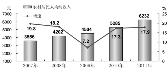 2007-2011年全省农村居民人均纯收入及其增长速度