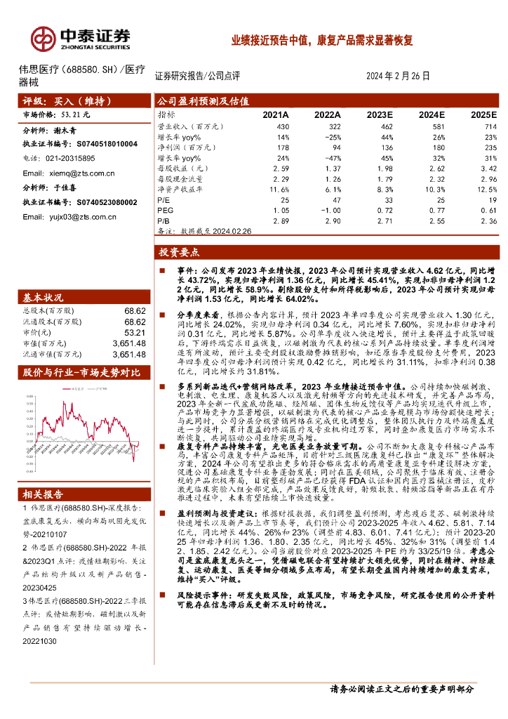 中泰证券:伟思医疗(688580)-业绩接近预告中值,康复产品需求显著恢复.pdf