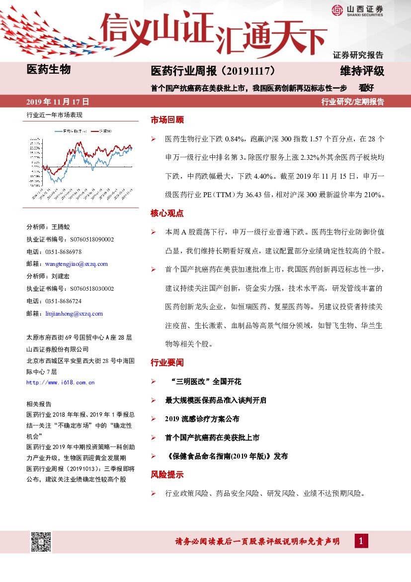 山西证券:医药行业周报:首个国产抗癌药在美获批上市,我国医药创新再迈标志性一步.pdf