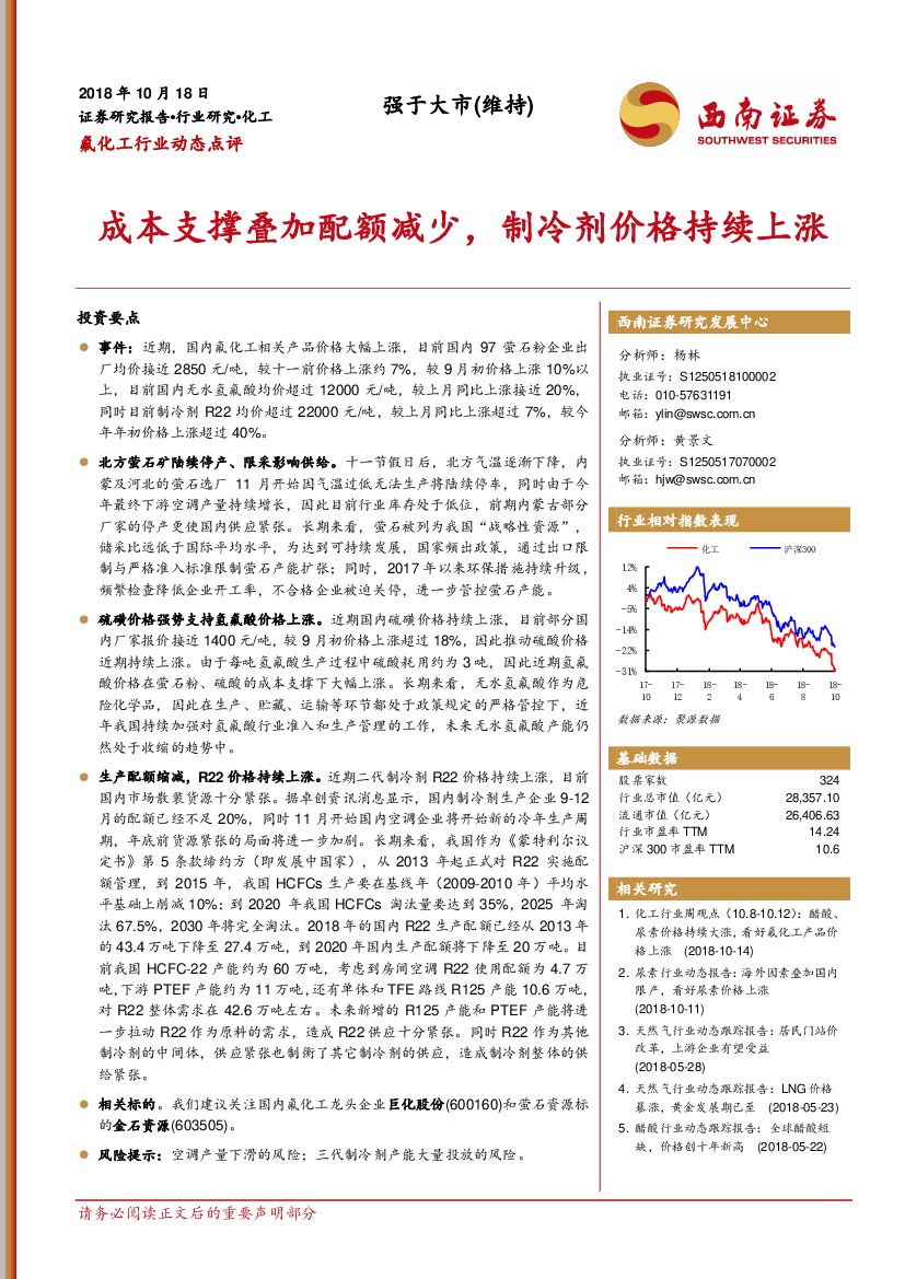 西南证券:氟化工行业动态点评:成本支撑叠加配额减少,制冷剂价格持续上涨.pdf