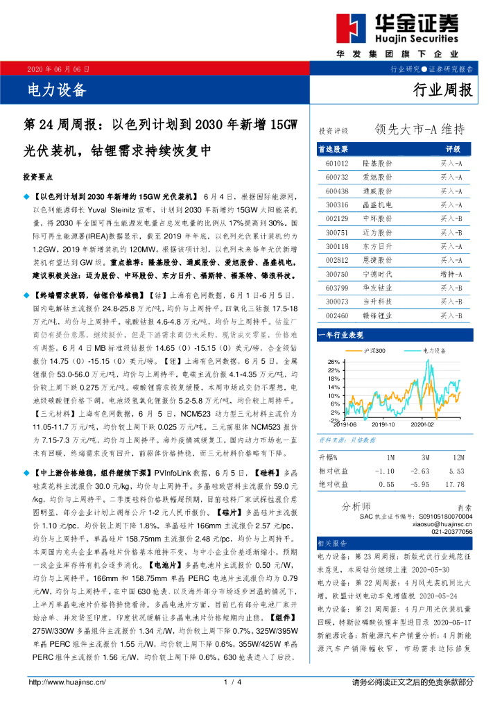 华金证券:电力设备第24周周报:以色列计划到2030年新增15GW光伏装机,钴锂需求持续恢复中.pdf