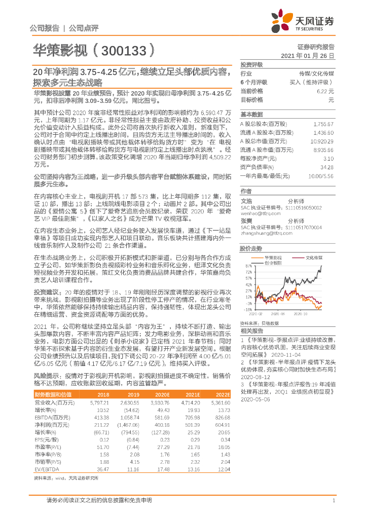 天风证券:华策影视(300133)-20年净利润3.75-4.25亿元,继续立足头部优质内容,探索多元生态战略.pdf