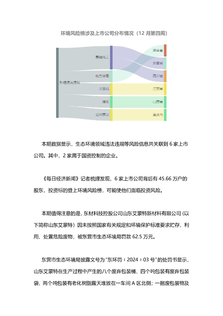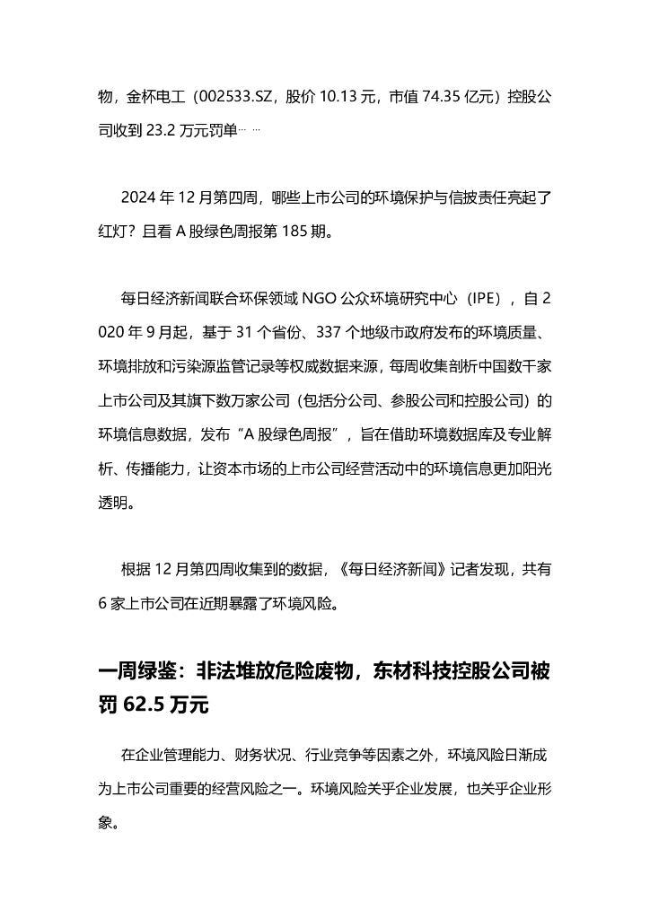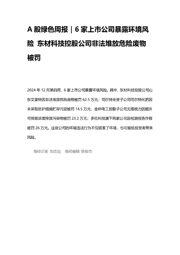A股绿色周报(2024年12月第四周 总第185期):6家上市公司暴露环境风险 东材科技控股公司非法堆放危险废物被罚.pdf