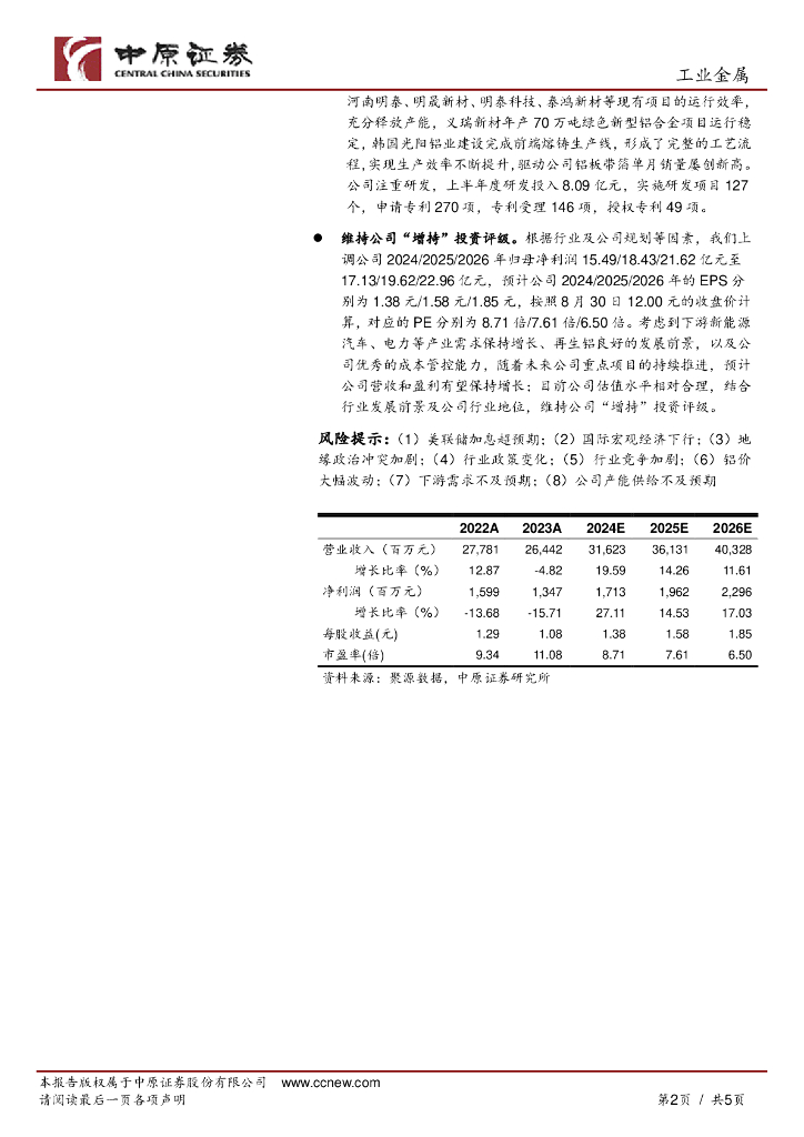 中原证券:明泰铝业(601677)-公司点评报告:铝板带箔销量保持增长,二季度盈利快速增长.pdf