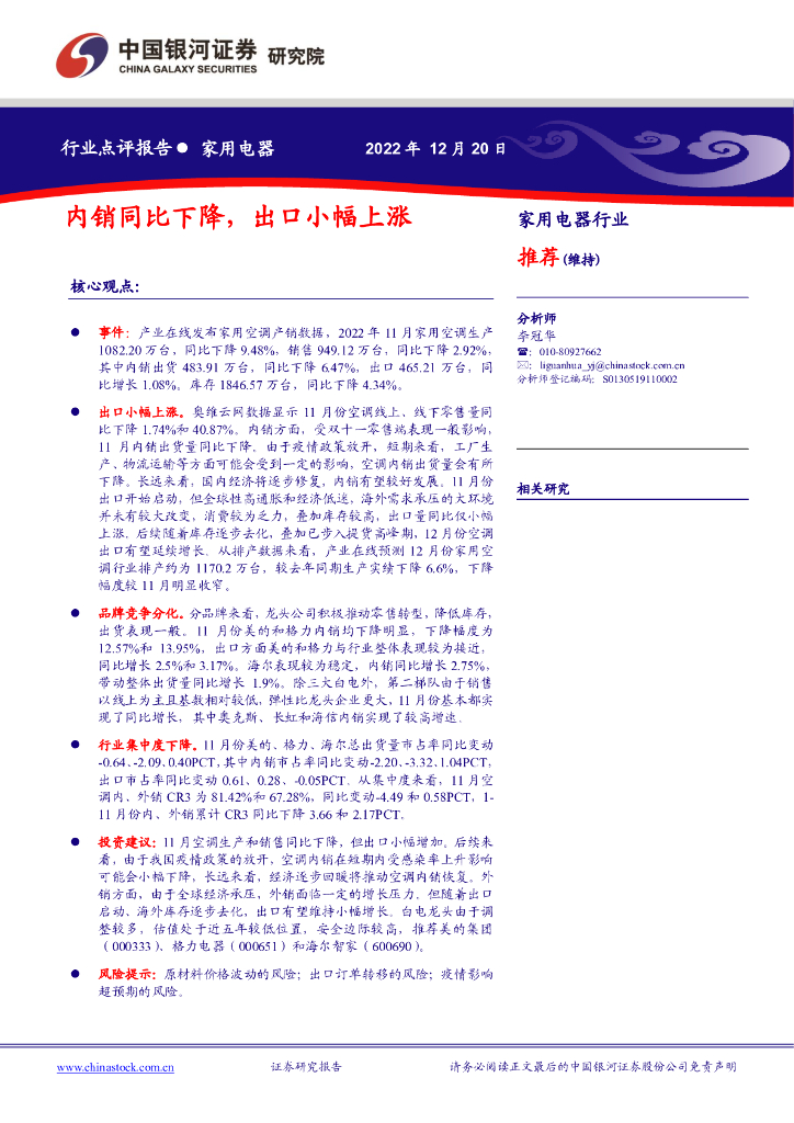 中国银河:家用电器行业:内销同比下降,出口小幅上涨.pdf