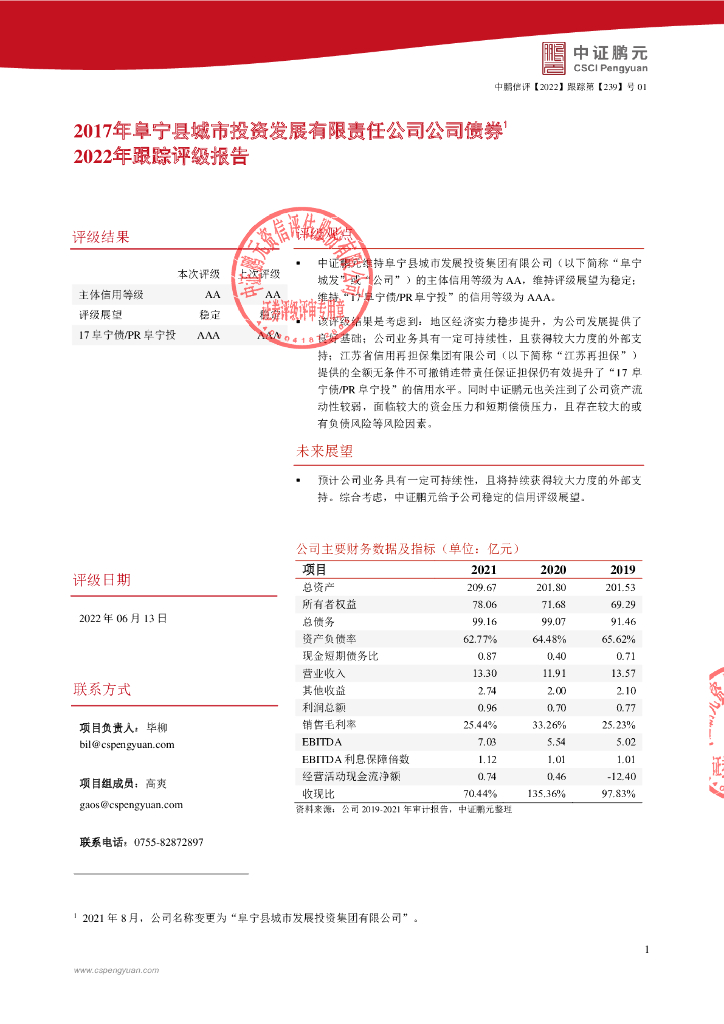 鹏元:2017年阜宁县城市投资发展有限责任公司公司债券2022年跟踪评级报告.pdf