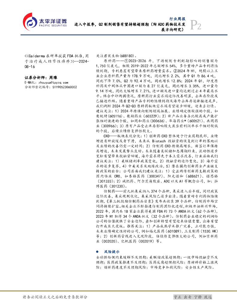 太平洋证券:医药行业周报:进入中报季,Q2制剂销售有望持续超预期(附ADC药物技术发展方向研究).pdf