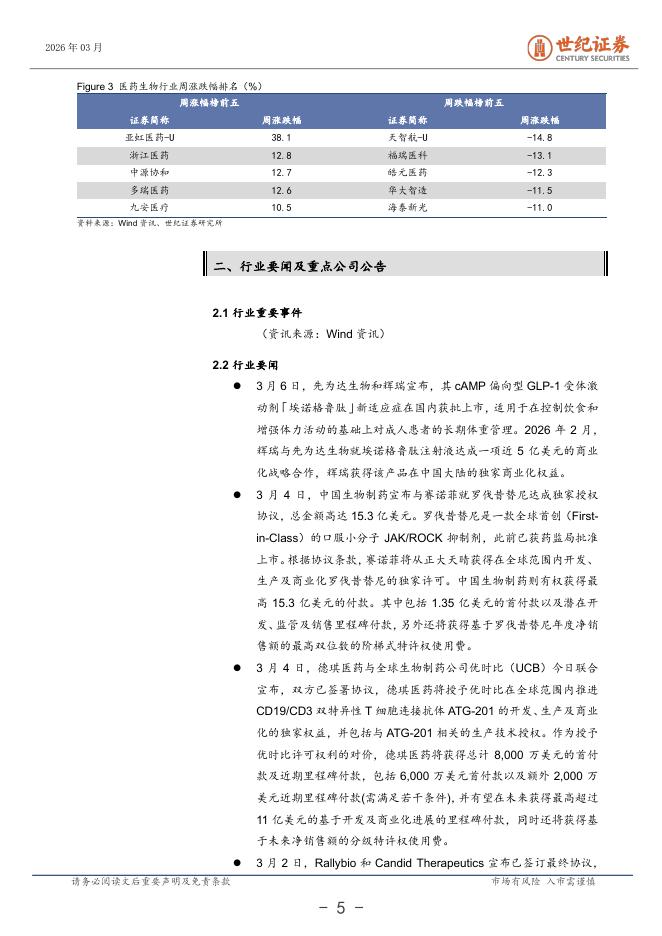 世纪证券:医药生物行业周报(3月第1周):国产创新药BD出海持续活跃.pdf