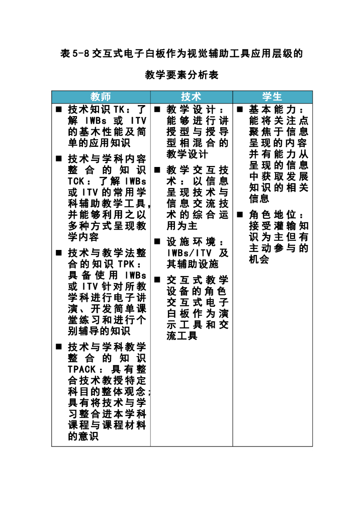 《现代教育技术应用》教学课件-表5-8交互式电子白板作为视觉辅助工具应用层级的教学要素分析表.pdf