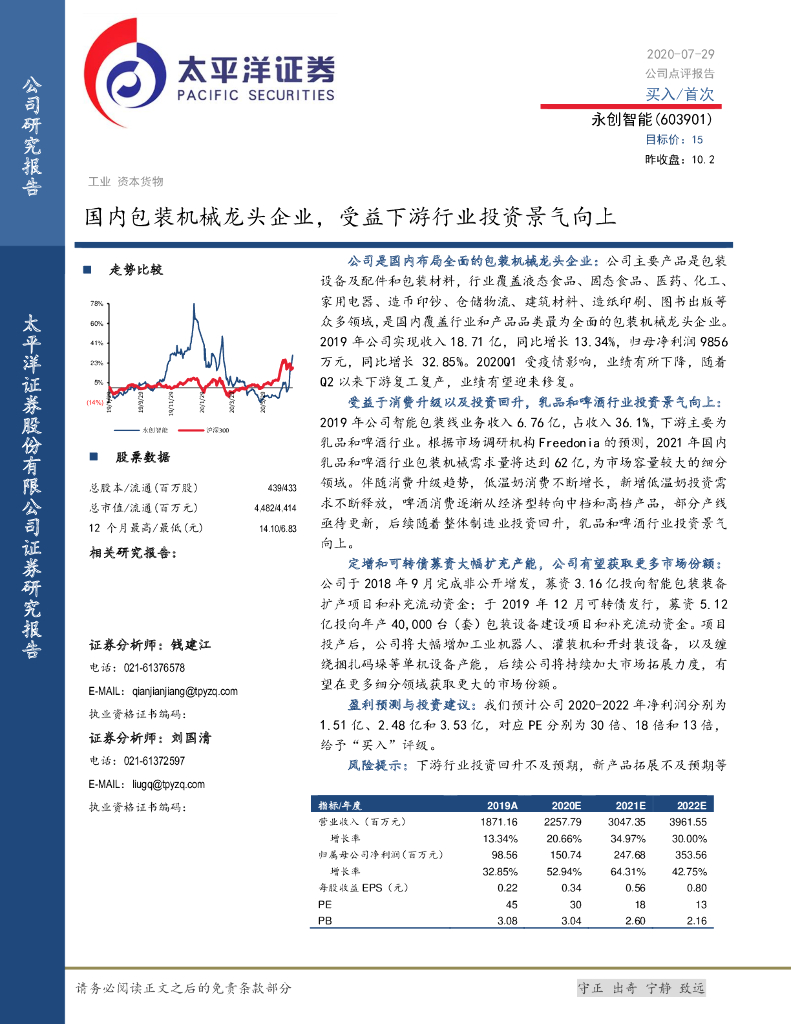 太平洋证券:永创智能(603901)-国内包装机械龙头企业,受益下游行业投资景气向上.pdf