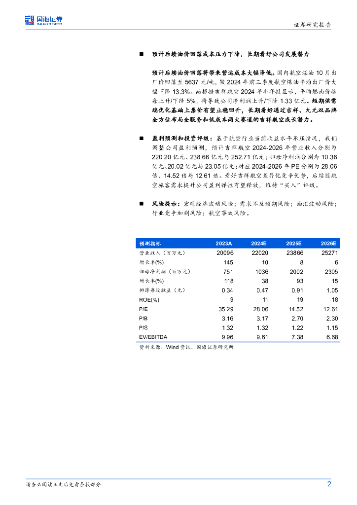 国海证券:吉祥航空(603885)-2024年三季报点评:Q3利润同比下滑,长期看好公司成长潜力.pdf