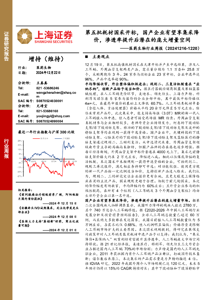 上海证券:医药生物行业周报:第五批耗材国采开标,国产企业有望享集采降价,渗透率提升后潜在的庞大增量空间.pdf