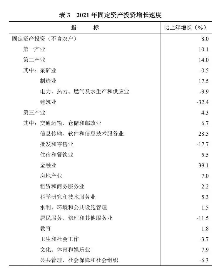 全年固定资产投资(不含农户)比上年增长8.0%。其中,民间投资增长9.6%。分经济类型看,国有投资下降5.1%,非国有投资增长12.9%。分投资方向看,民生工程投资下降3.8%,生态环境投资增长3.9%,基础设施投资增长3.6%,高技术产业投资