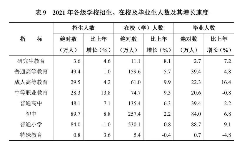 年末有普通高校114所。研究生教育毕业生2.7万人,普通高等教育毕业生39.4万人,中等职业教育毕业生20.6万人,普通高中毕业生39.4万人,初中毕业生84.0万人,普通小学毕业生88.7万人。在园幼儿229.4万人,比上年下降0.9%。小学适龄儿童入学率
