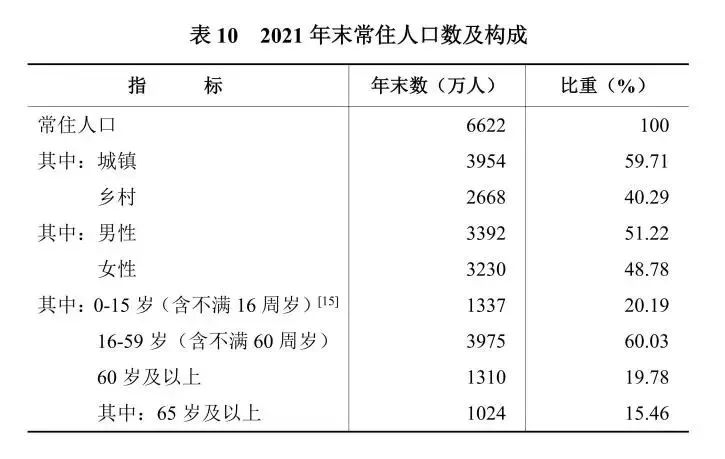 年末全省常住人口6622万人。其中,城镇人口3954万人,城镇化率59.71%,比上年末提高0.95个百分点。全年出生人口47.3万人,出生率7.13‰;死亡人口54.93万人,死亡率8.28‰;人口自然增长率-1.15‰。0—15岁(含不满16周岁)人口占常住人口的比重为20.19%,下降0.56个百分点;16—59岁(含不满60周岁)人口比重为60.03%,提高0.65个百分点;60岁及以上人口比重为19.78%,下降0.10个百分点。