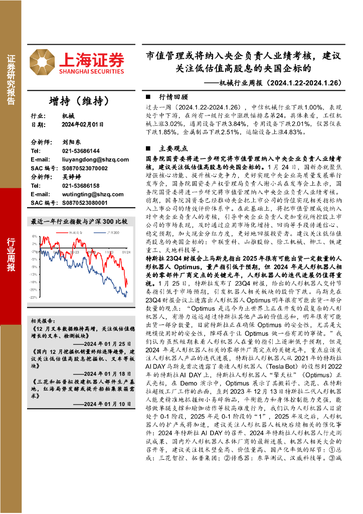 上海证券:机械行业周报:市值管理或将纳入央企负责人业绩考核,建议关注低估值高股息的央国企标的.pdf