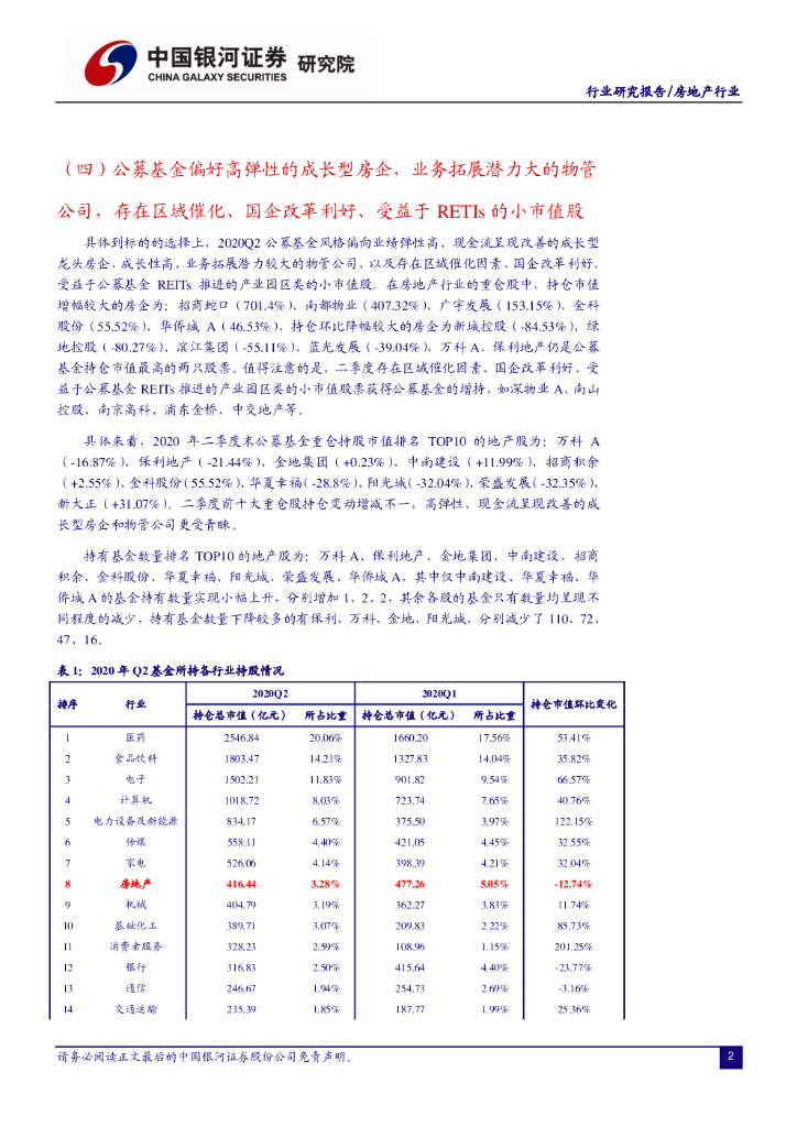 中国银河:房地产行业:20Q2公募基金对房地产板块配置比例连续两个季度下降,偏好高弹性的成长类房企、物管公司及小市值股.pdf