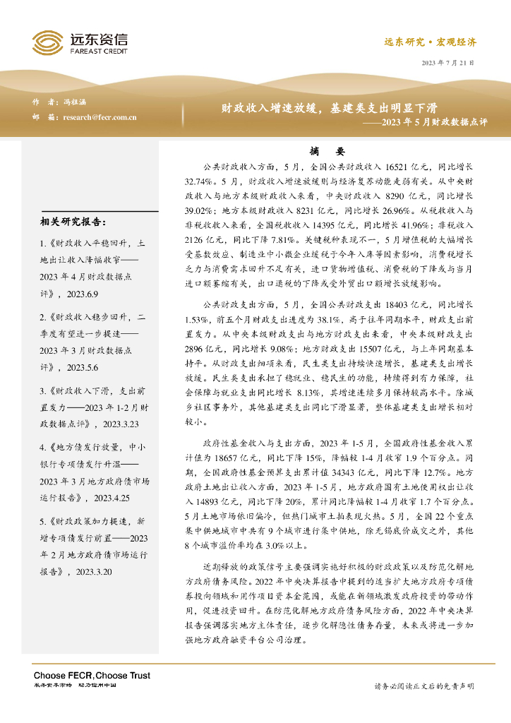 远东资信:财政收入增速放缓,基建类支出明显下滑——2023年5月财政数据点评.pdf