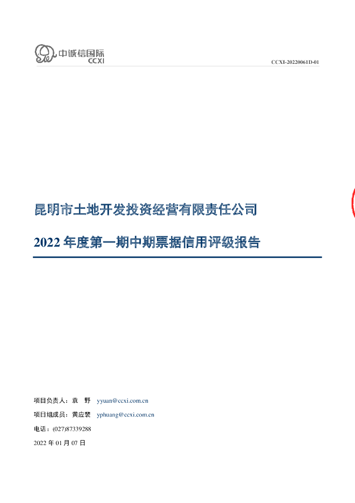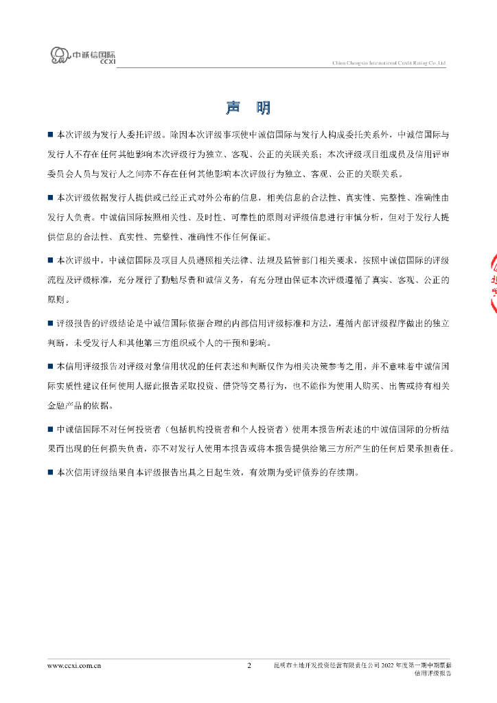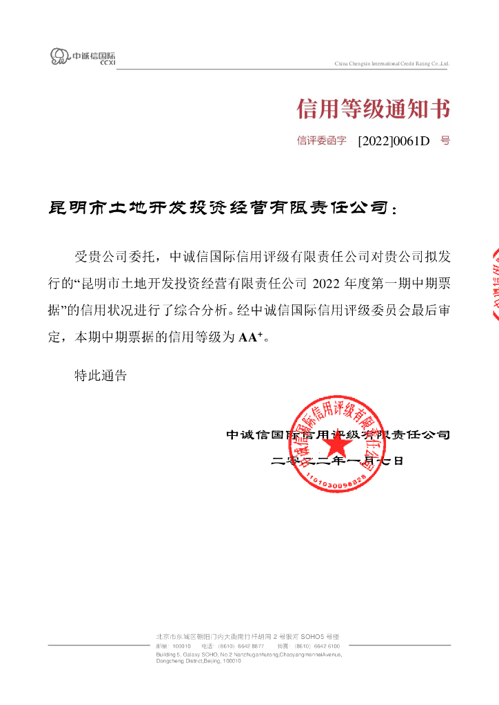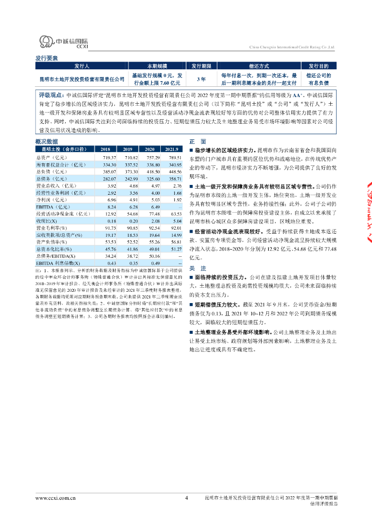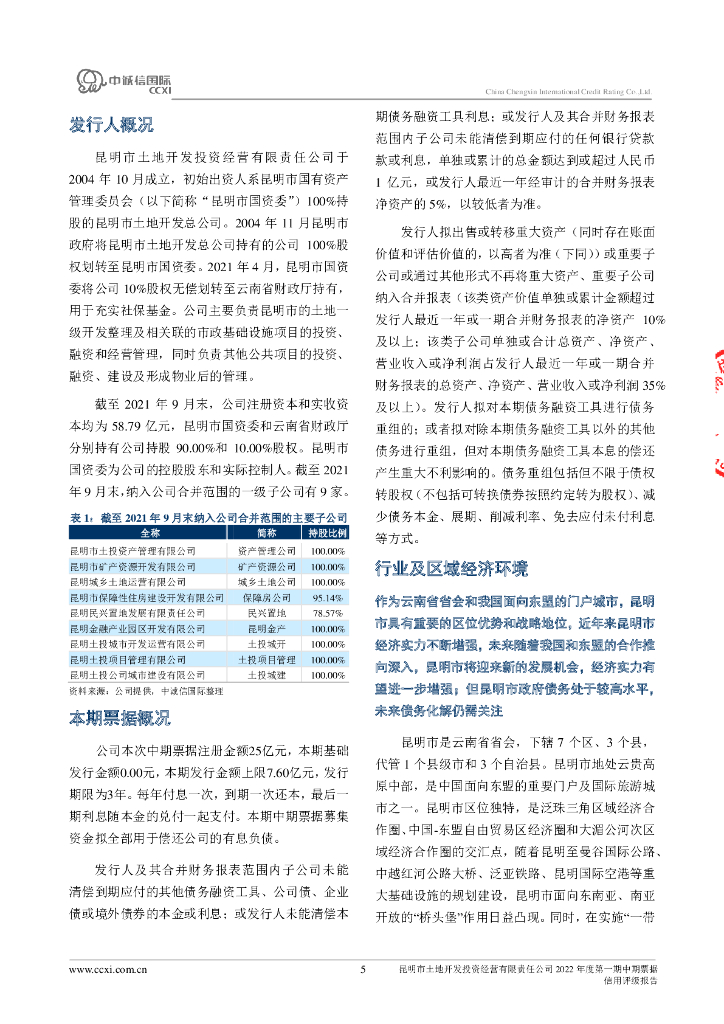 中诚信:昆明市土地开发投资经营有限责任公司2022年度第一期中期票据信用评级报告及跟踪评级安排.pdf