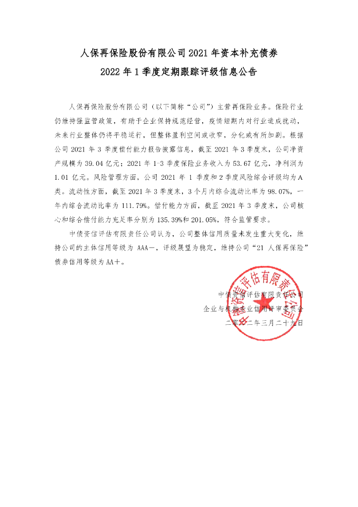 中债资信:人保再保险股份有限公司2021年资本补充债券2022年1季度定期跟踪评级信息公告.pdf
