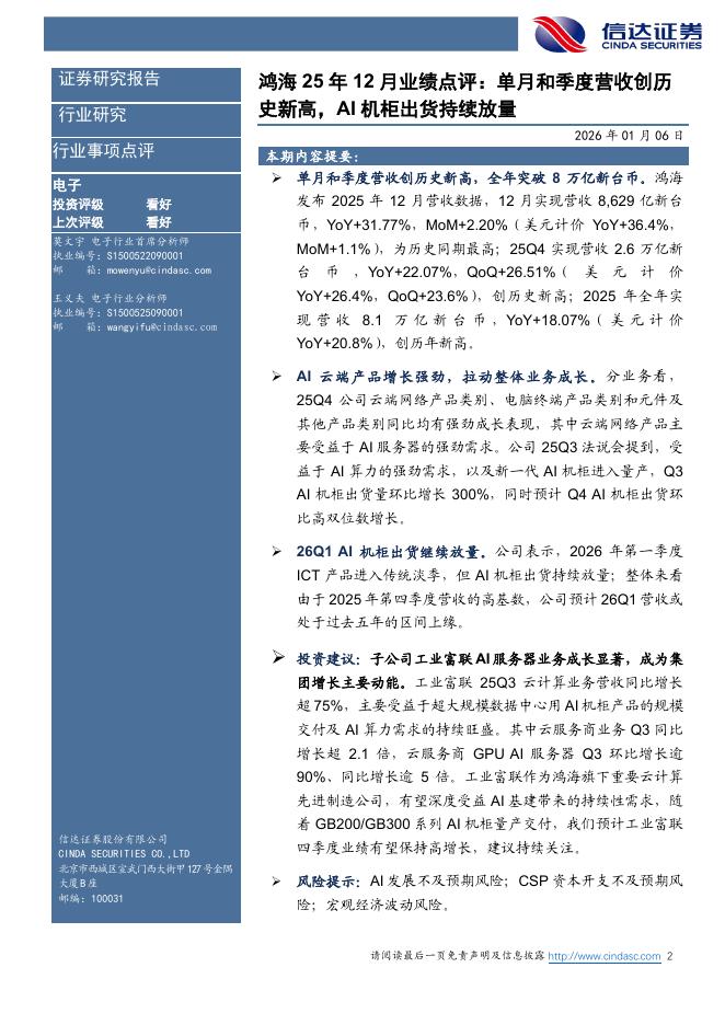 信达证券:电子行业鸿海25年12月业绩点评:单月和季度营收创历史新高,AI机柜出货持续放量.pdf