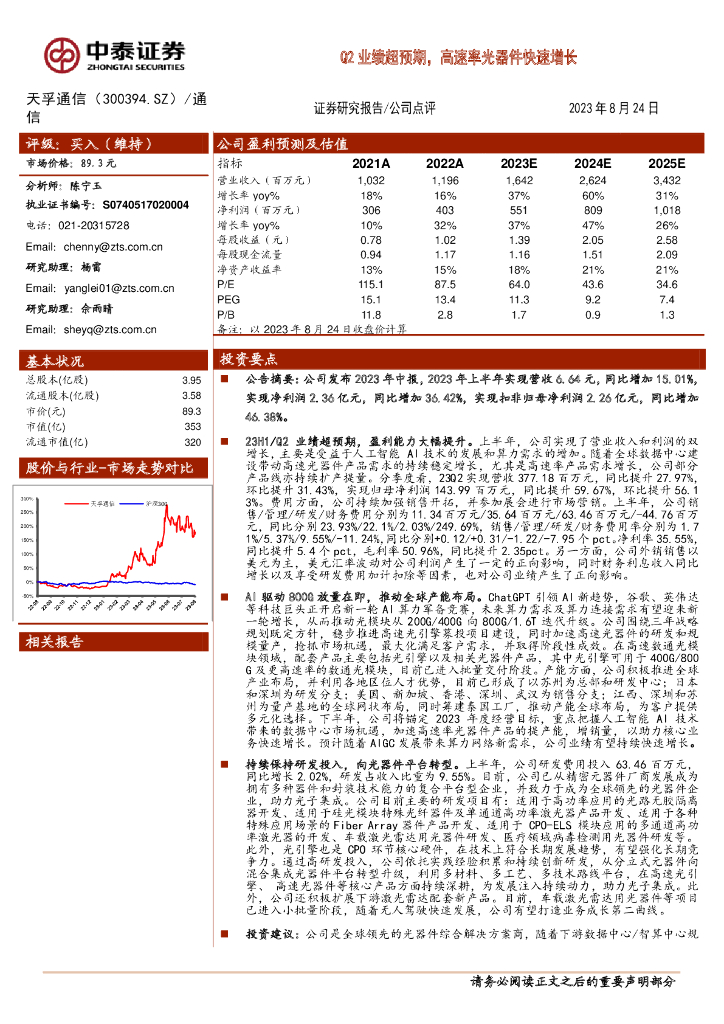 中泰证券:天孚通信(300394)-Q2业绩超预期,高速率光器件快速增长.pdf