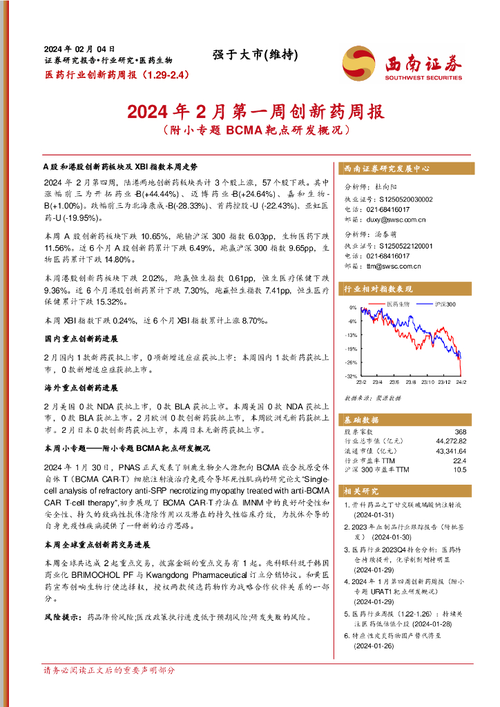 西南证券:医药行业创新药周报:2024年2月第一周创新药周报(附小专题BCMA靶点研发概况).pdf