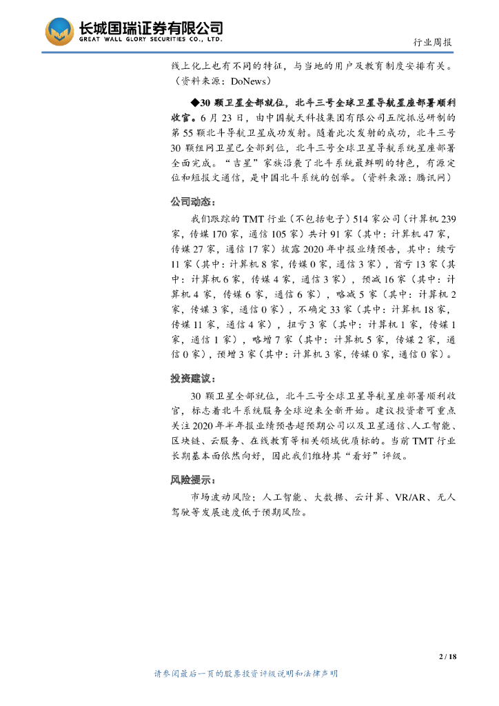 长城国瑞证券:TMT行业周报2020年第18期(总第102期):北斗三号全球卫星导航星座部署收官,中国人工智能市场规模达28.9亿美元.pdf