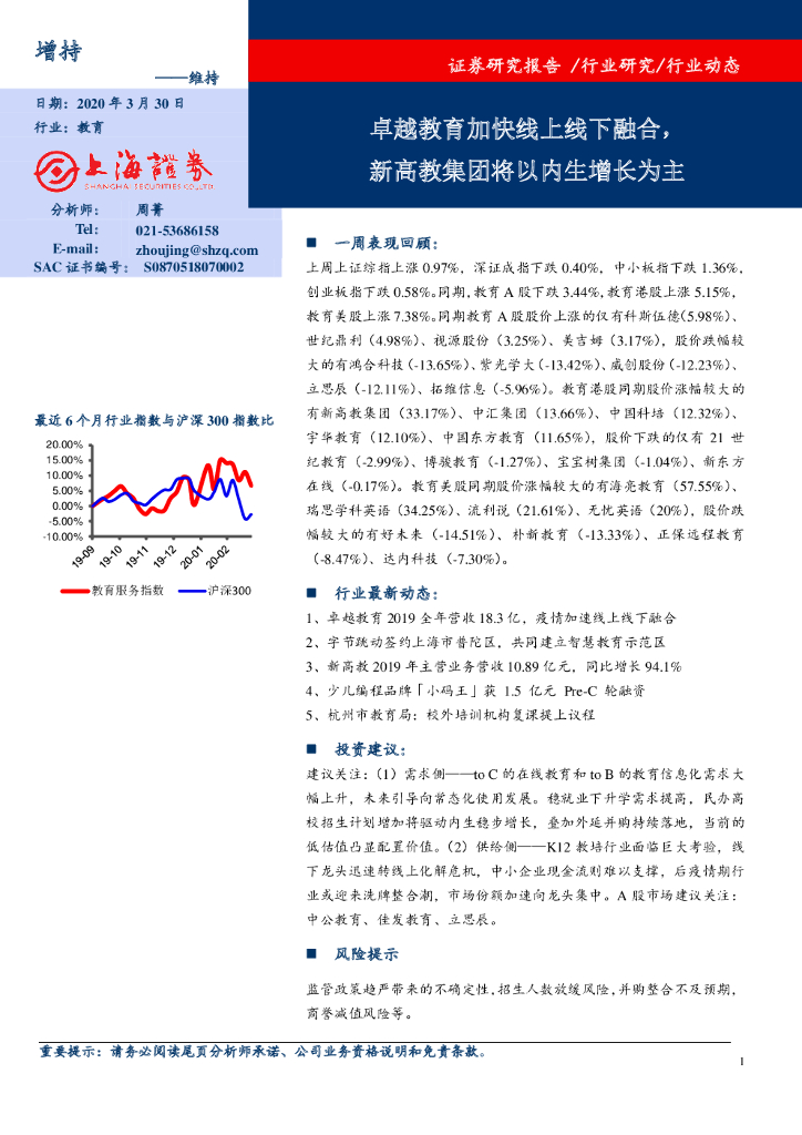 上海证券:教育行业动态:卓越教育加快线上线下融合,新高教集团将以内生增长为主.pdf