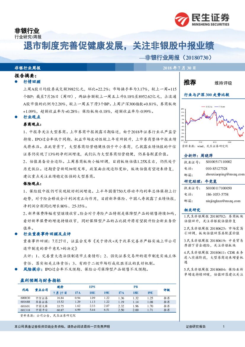 民生证券:非银行业周报:退市制度完善促健康发展,关注非银股中报业绩.pdf