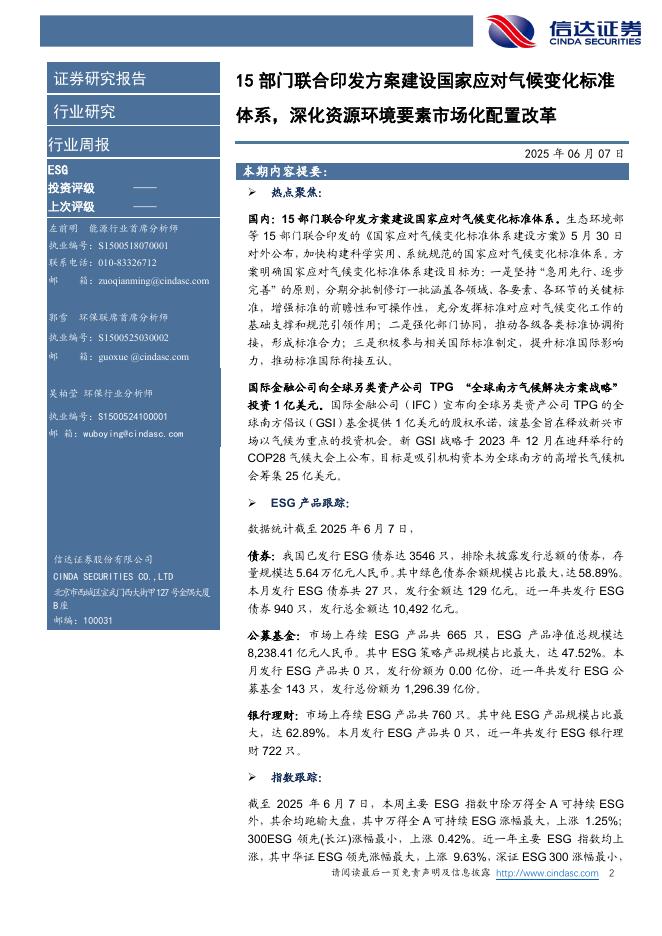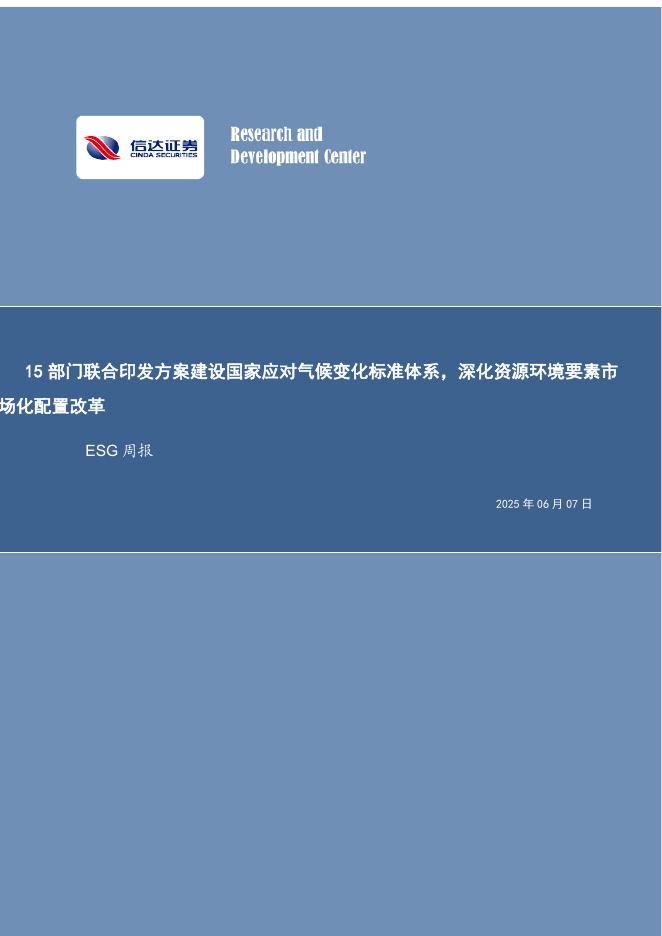 信达证券:ESG周报:15部门联合印发方案建设国家应对气候变化标准体系,深化资源环境要素市场化配置改革.pdf