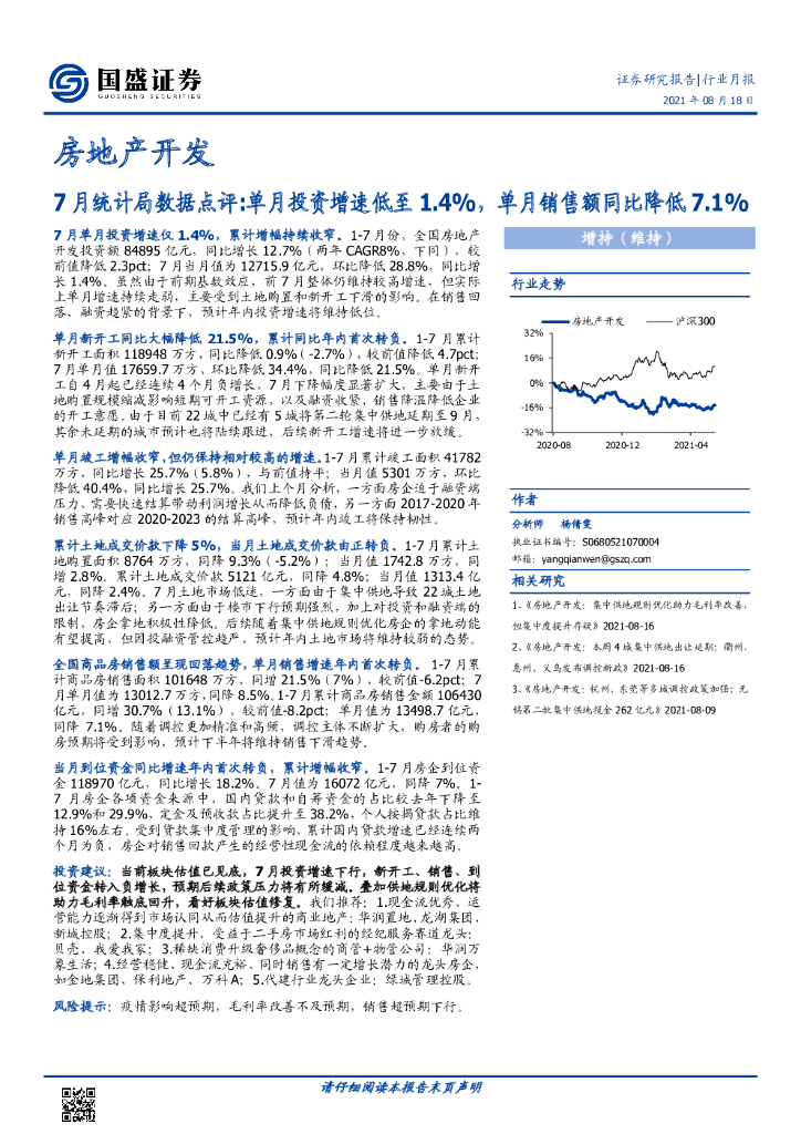 国盛证券:房地产开发7月统计局数据点评:单月投资增速低至1.4%,单月销售额同比降低7.1%.pdf