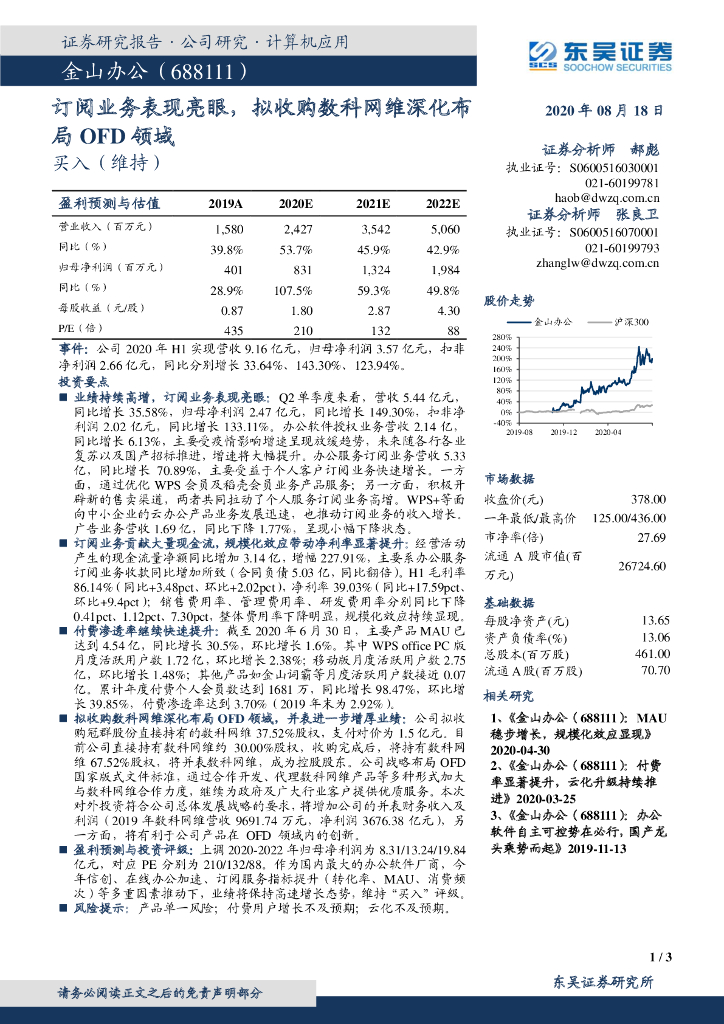 东吴证券:金山办公(688111)-订阅业务表现亮眼,拟收购数科网维深化布局OFD领域.pdf
