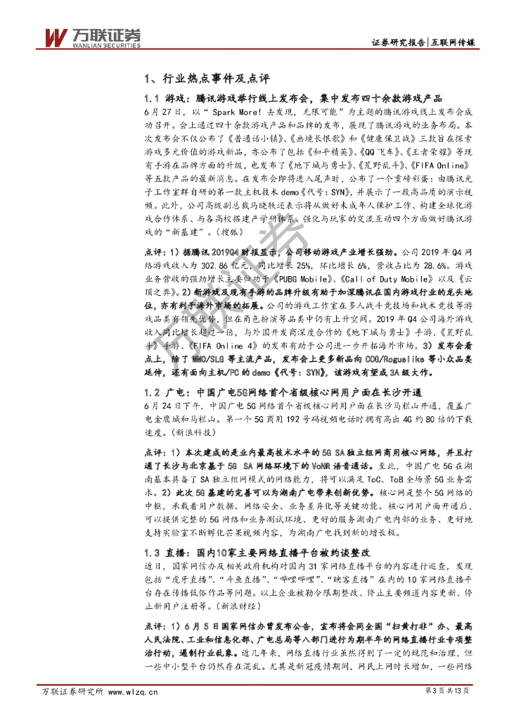 万联证券:互联网传媒行业周观点:腾讯游戏发布会举行,广电5G首个省级核心网开通.pdf