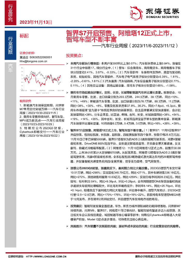 东海证券:汽车行业周报:智界S7开启预售、阿维塔12正式上市,智驾车型不断丰富.pdf