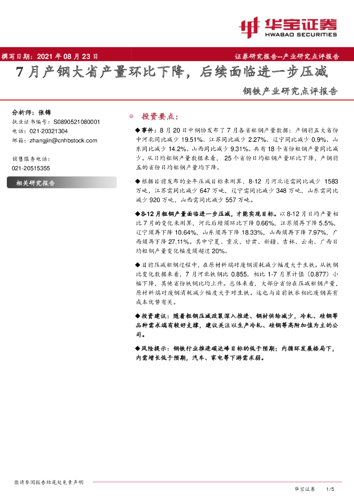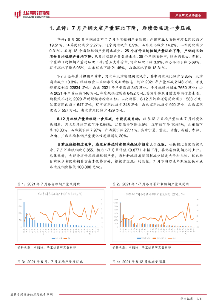 华宝证券:钢铁产业研究点评报告:7月产钢大省产量环比下降,后续面临进一步压减.pdf