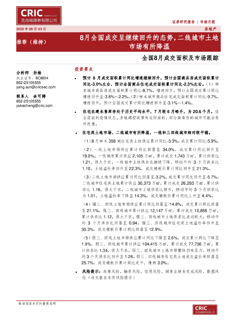 克而瑞证券:全国8月成交面积及市场跟踪:8月全国成交呈继续回升的态势,二线城市土地市场有所降温.pdf