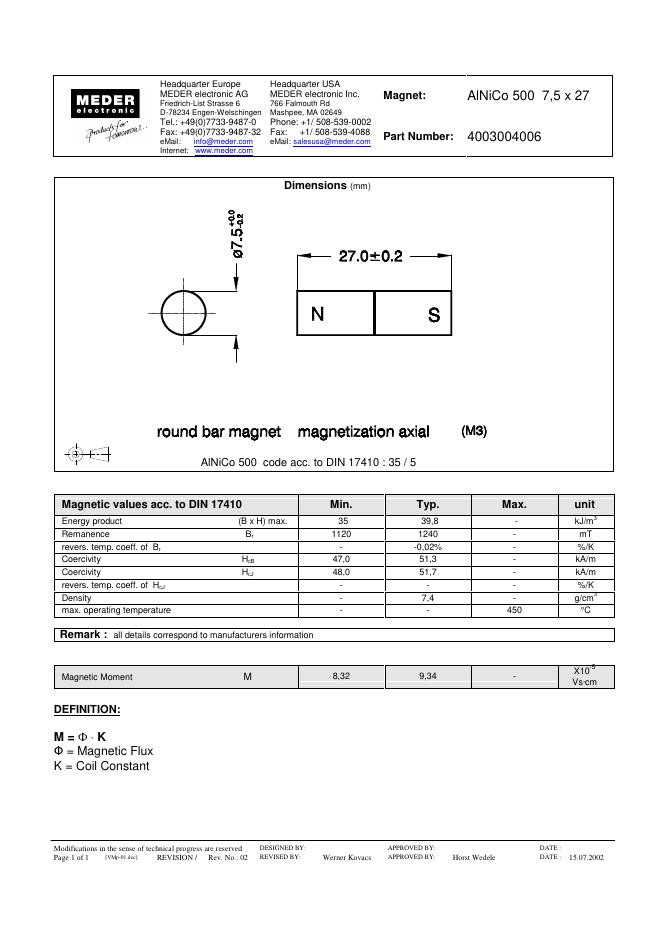 MEDER Magnet: AlNiCo 500 7,5 x 27 数据手册.pdf