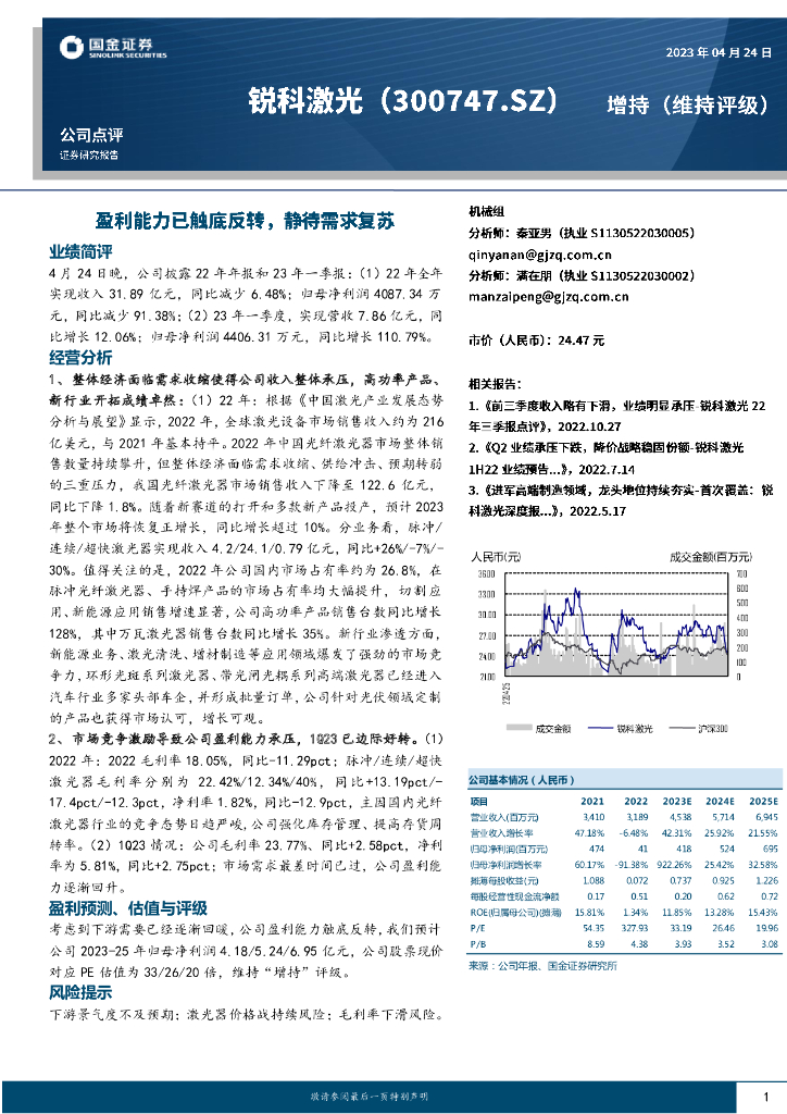 国金证券:锐科激光(300747)-盈利能力已触底反转,静待需求复苏.pdf