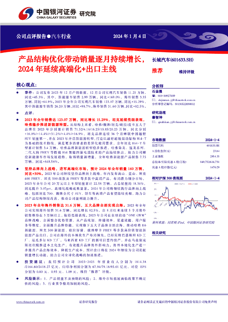 中国银河:长城汽车(601633)-产品结构优化带动销量逐月持续增长,2024年延续高端化+出口主线.pdf